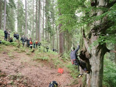 Im Rahmen der Veranstaltung wurde auch die „Vielfalt braucht Bewirtschaftung“ vorgestellt – eine gemeinsame Kommunikationsinitiative der steirischen Waldwirtschaft. Die Steiermark zeigt mit dieser Initiative Pioniergeist – und nimmt eine Vorreiterrolle in der Kommunikation rund um nachhaltige Waldbewirtschaftung ein. Der Stakeholderdialog brachte VertreterInnen aus Verwaltung, Bildung, Medien und Praxis zusammen. Fachliche Impulse, ein gemeinsamer Waldausgang und der persönliche Austausch standen ebenso auf dem Programm wie eine Live-Demonstration durch einen Baumkletterer, der zeigte, wie Kronenproben für die Forschung gewonnen werden.